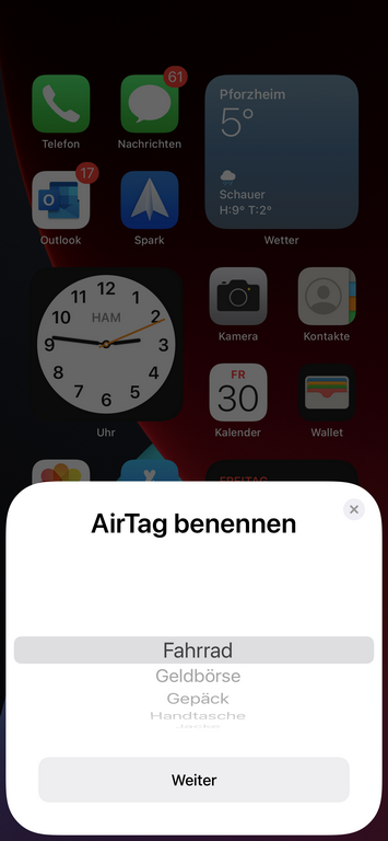 Nachdem die Verbindung erfolgreich hergestellt wurde, kann man einen Namen für den AirTag vergeben. Dafür stehen eine Vielzahl von Objekten zur Verfügung, aber später lässt sich dies auch komplett frei noch in den Einstellungen ändern.