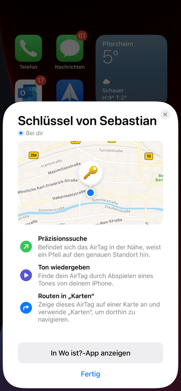 Sobald dieser Vorgang abgeschlossen ist, wird auf die App Wo ist? hingewiesen. Mit Hilfe dieser App lässt sich nun der AirTag orten oder auch ein Ton auf dem AirTag wiedergeben.