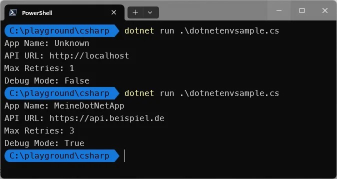Console.WriteLine($"Debug Mode: {debugMode}");C#Mit Env.Load() werden alle Werte aus der .env-Datei in die Umgebungsvariablen des aktuellen Prozesses geladen. Danach kannst du sie über Environment.GetEnvironmentVariable(...) abrufen.