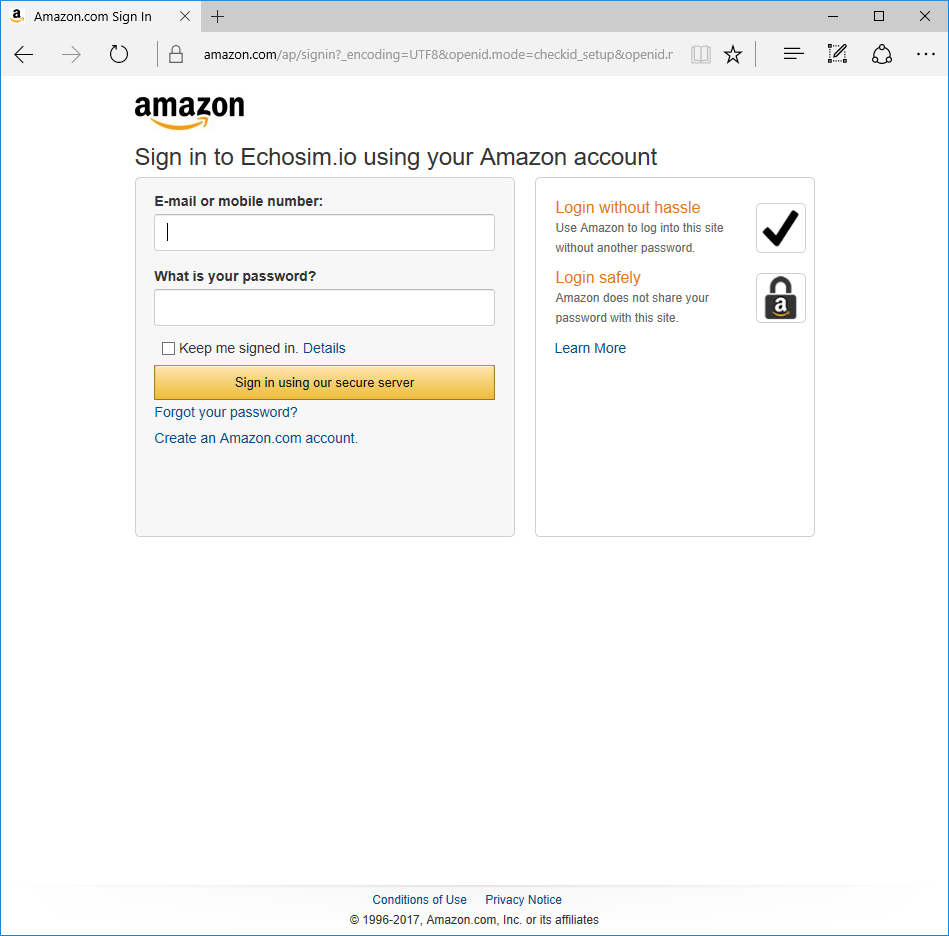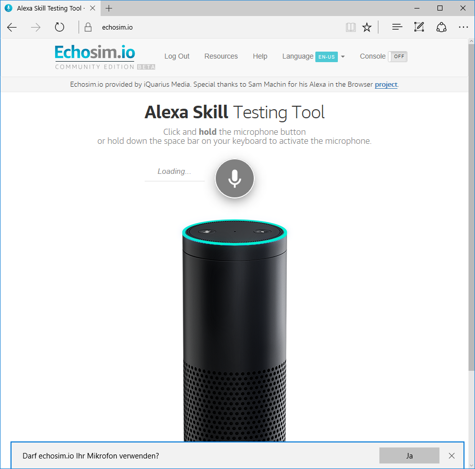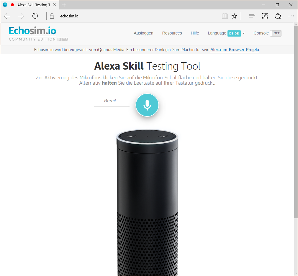 Wer seinen ersten eigenen Skill für Alexa entwickeln möchte, aber noch keinen Echo zu Hause hat, kann auf die Webseite echosim.io zurückgreifen, welche einen Echo simuliert und damit die Kommunikation mit Alexa ermöglicht.