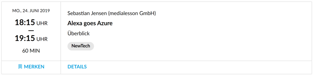 Ich bin dieses Mal als Sprecher dabei und gebe am 24. Juni eine Einführung in die Skill-Entwicklung mit der Hilfe von Alexa und Microsoft Azure.