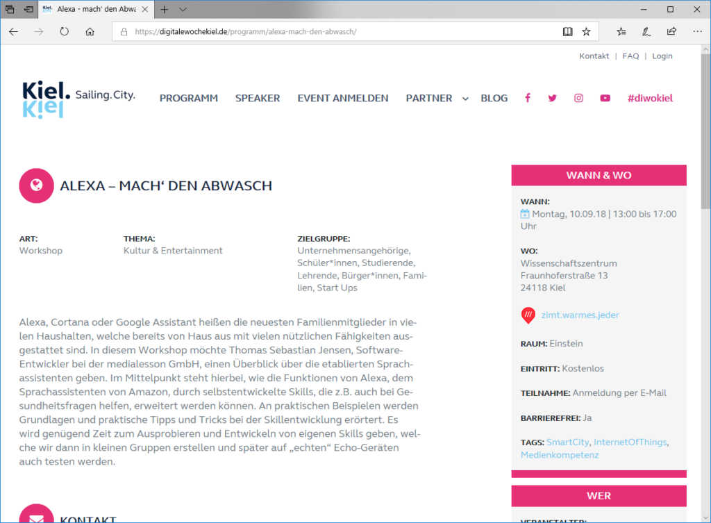 In wenigen Tagen ist es bereits wieder so weit und zum zweiten Mal findet die Digitale Woche Kiel statt. Zwischen dem 08. und 15. September finden hier an verschiedenen Orten in der Landeshauptstadt Kiel eine Vielzahl von unterschiedlichen Workshops, Vorträgen oder Konferenzen statt. Letztes Jahr war ich bereits ein Teil dieser Veranstaltung und habe den Leuten einen Einblick mit der Microsoft HoloLens ermöglicht. Auch in diesem Jahr bin ich mit einer eigenen Veranstaltung dabei und möchte in einem Workshop zeigen, wie man schnell und einfach seinen eigenen Alexa-Skill entwickeln kann.