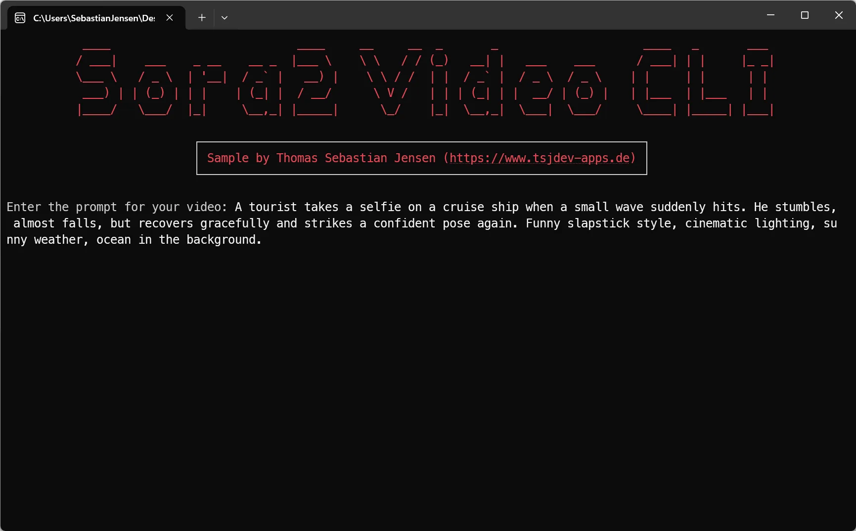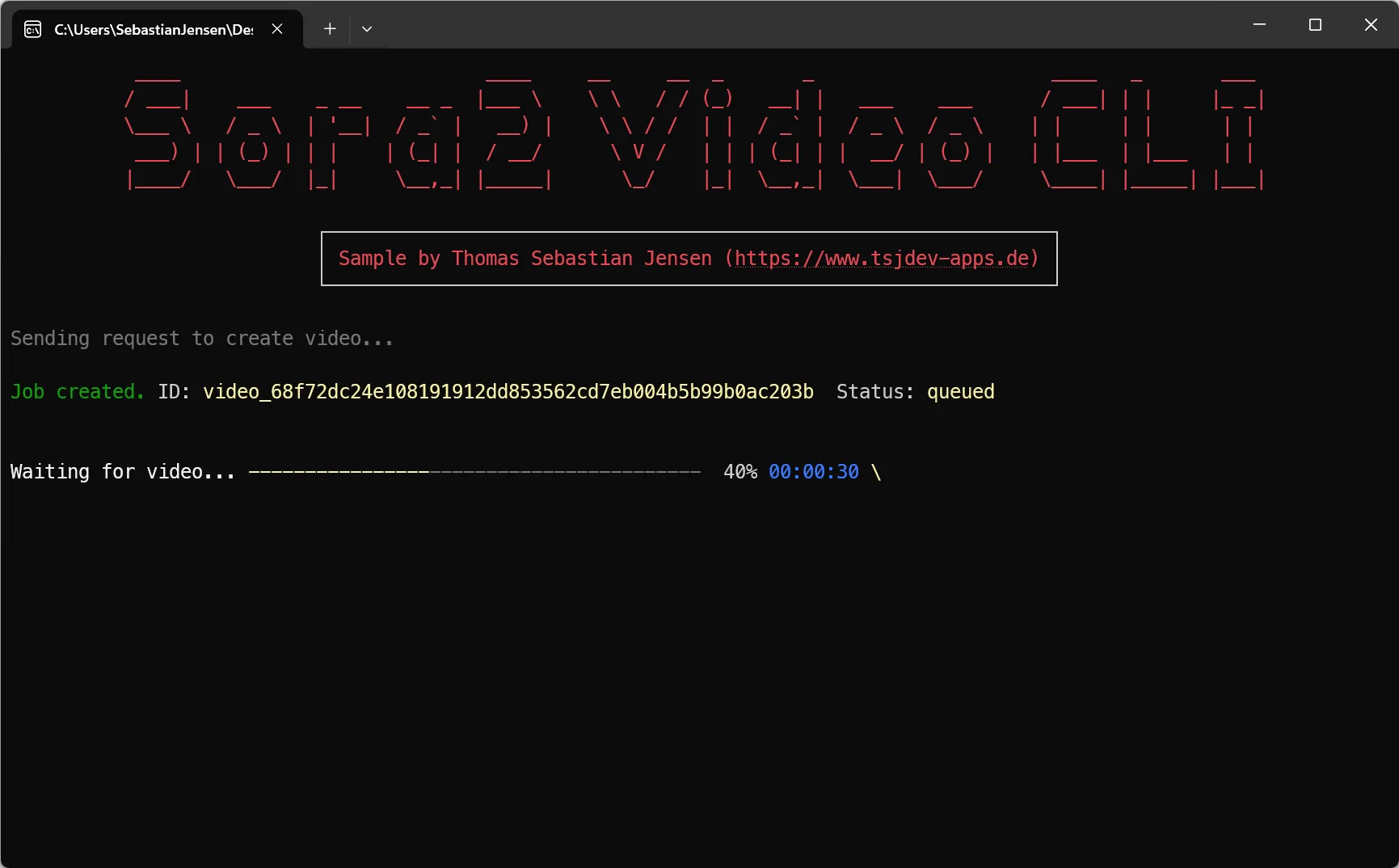 Die Konsolen-App sendet die Anfrage an die OpenAI Video API und wartet, bis die Video-Generierung fertiggestellt ist.