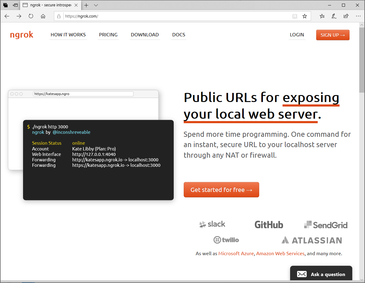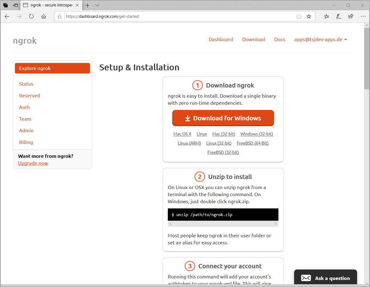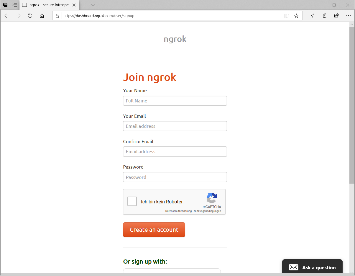 Das Tool ngrok steht sowohl kostenfrei als auch kostenpflichtig zur Verfügung. Um jedoch einfach ein bisschen zu testen oder einem weiteren Entwickler die Option zum Testen zu geben, genügt die kostenfreie Version aus. Über den Button Get started for free starten wir den Registrierungsprozess.
