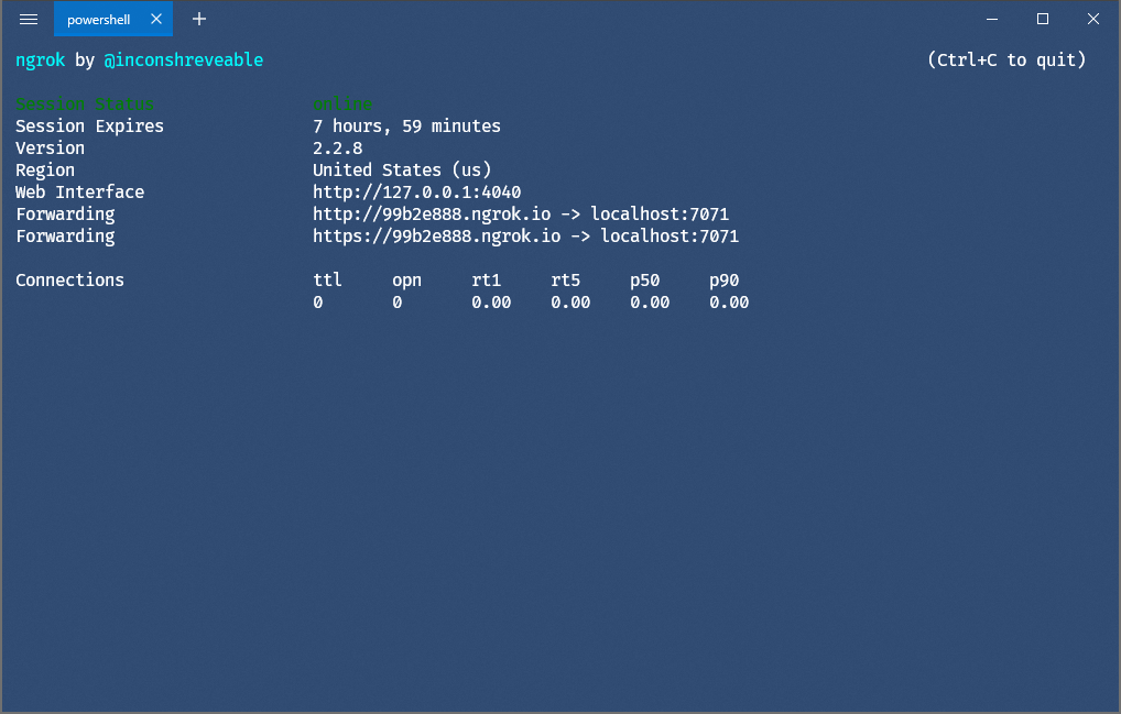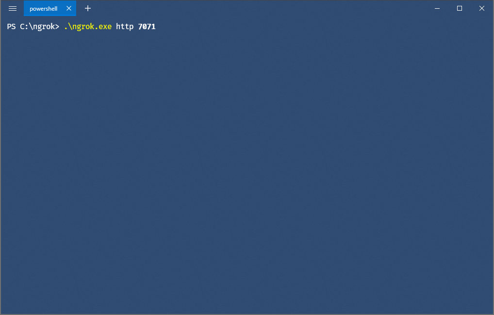 Wir öffnen nun eine PowerShell und navigieren zu der ngrok-Datei. Nun lassen wir uns eine URL erzeugen über .\ngrok.exe http 7071, denn aktuell läuft die Azure Function über diesen Port.
