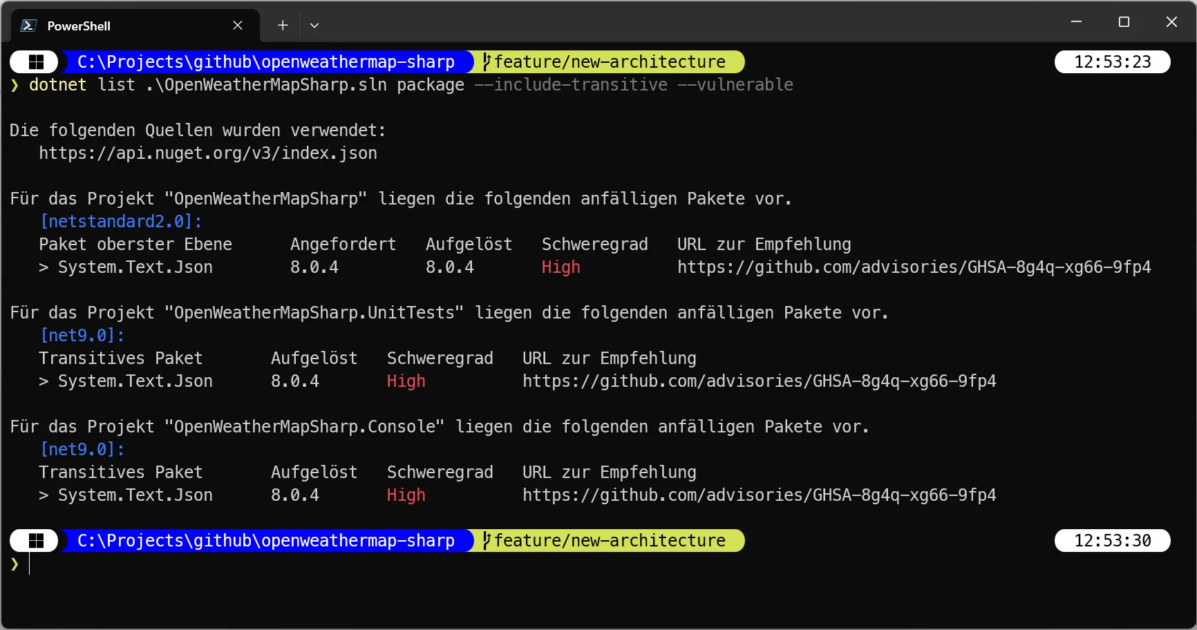 dotnet list .\OpenWeatherMapSharp.sln package --include-transitive --vulnerable