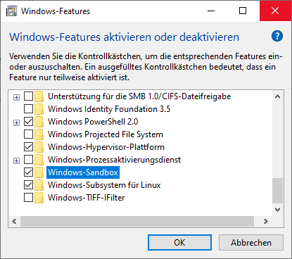 In dem Dialog suchen wir nun nach Windows Sandbox und überprüfen, ob das Häkchen entsprechend gesetzt ist. Bei mir ist dies schon der Fall. Sollte das Häkchen bei euch noch nicht gesetzt sein, so könnt ihr es einfach setzen und mit OK bestätigen. Es werden dann alle notwendigen Dinge eingerichtet und am Ende müsst ihr einen Neustart auf eurem Rechner durchführen.